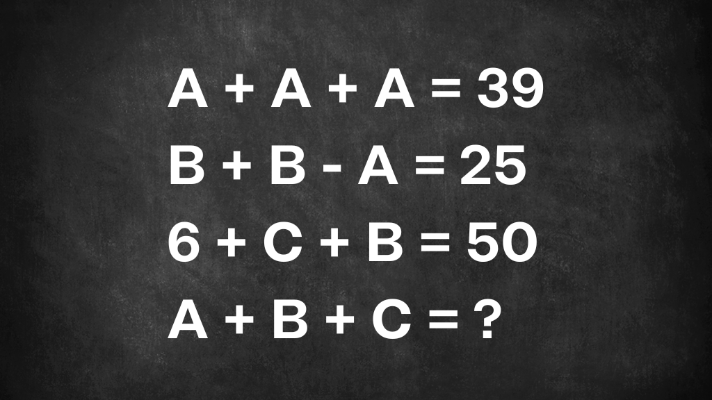 A + A + A = 39 B + B – A = 25 6 + C + B = 50 A + B + C = ?