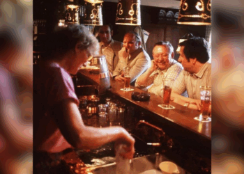 Et par mænd ved baren, ølglas i hånden. Der grines, snakkes, måske bliver der også lidt brokket over vejret eller...